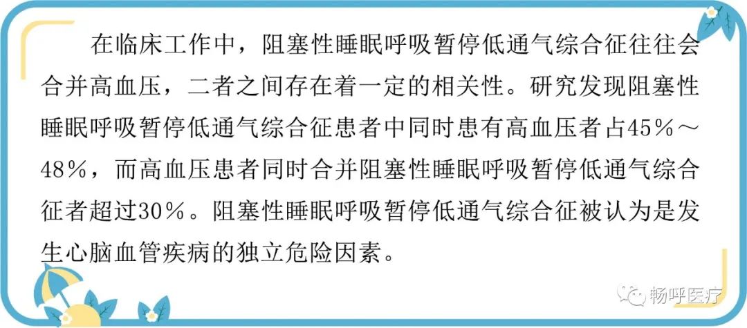 對于中、重度高血壓患者若其藥物聯(lián)合治療效果差時應考慮是否為阻塞性睡眠呼吸暫停低通氣綜合征導致的血壓升高。當治療了睡眠呼吸暫停低通氣綜合征,那么血壓也會得到非常良好的控制。