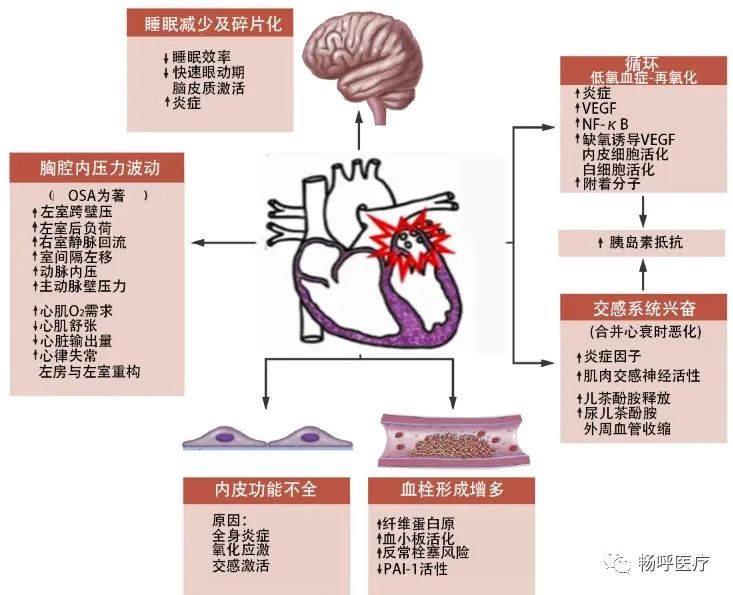 ①間斷低氧血癥及高碳酸血癥引起交感神經活性增加,體內腎素-血管緊張素Ⅱ-醛固酮系統(tǒng)激活,血漿兒茶酚胺水平升高,外周血管阻力加大從而導致高血壓。②OSAHS患者呼吸暫停低通氣指數升高、血氧飽和度降低,加速了血管內皮細胞的凋亡,進而損害血管內皮依賴性舒血管物質的功能,打破了舒血管物質及縮血管物質之間的平衡,引起血壓升高。③反復的缺氧激發(fā)了炎癥物質的釋放以及氧化應激的增強,使血管內皮破壞增加。④慢性間歇性低氧血癥通過興奮交感神經,刺激多種激素分泌,引起血糖增高、胰島素抵抗,使胰島素調節(jié)血管內皮的舒張功能減弱。⑤此外,還有胸腔內負壓增高所導致的機械效應、遺傳以及年齡等諸多因素。
